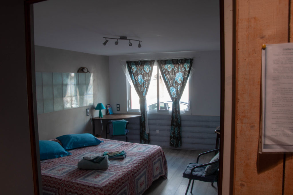 Aménagé dans le chai rénové du domaine, cet espace PMR du rez de chaussée comprend la chambre sur lie pour 2 personnes (avec option lits séparables sur demande) avec 1 coin lavabo et  kitchenette  en chambre ; juste à coté les sanitaires PMR (lavabo, douche et WC).